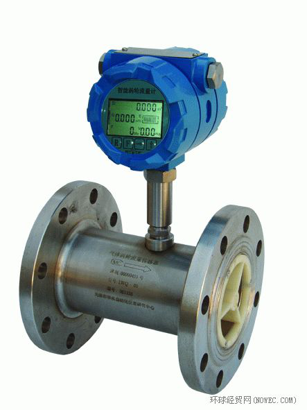 采用涡轮进行测量的流量计。它先将流速转换为涡轮的转速,再将转速转换成与流量成正比的电信号。这种流量计用于检测瞬时流量和总的积算流量,其输出信号为频率,易于数字化。感应线圈和永久磁铁一起固定在壳体上。当铁磁性涡轮叶片经过磁铁时,磁路的磁阻发生变化,从而产生感应信号。信号经放大器放大和整形,送到计数器或频率计,显示总的积算流量。同时将脉冲频率经过频率-电压转换以指示瞬时流量。叶轮的转速正比于流量,叶轮的转数正比于流过的总量。涡轮流量计的输出是频率调制式信号,不仅提高了检测电路的抗干扰性,而且简化了流量检测系统。它的量程比可达10:1,精度在±0.2%以内。惯性小而且尺寸小的涡轮流量计的时间常数可达0.01秒。