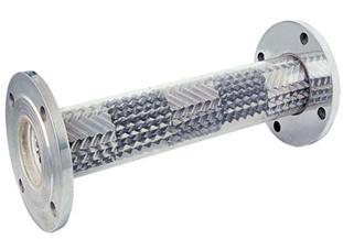 管道混合器也称管式静态混合器,这种混合器由管子和内装的促进混合的元件等组成。混合元件常用的形式有螺旋片式和混合头式。静态混合器结构简单紧凑,无传动部件,物料停留时间短(一般仅数秒),混合效率高,能耗低,安装维护和清洗方便。它主要用作高粘度液体的混合器和气液反应器等。